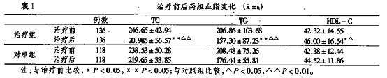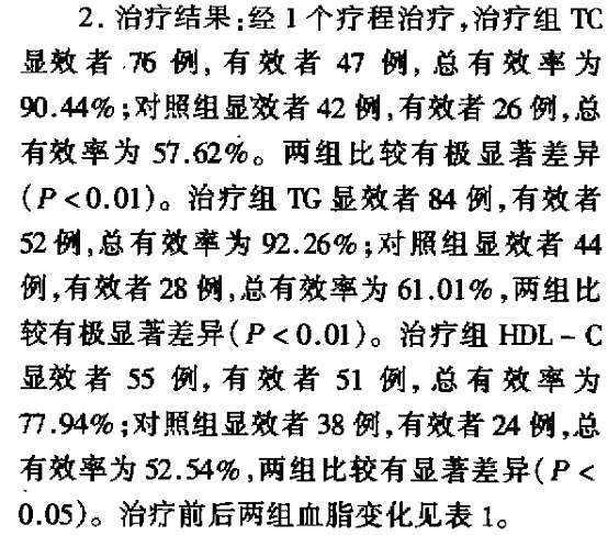 治疗后TC、TG降至正常,或分别下降20%、30%为显效,分别下降10%、20% 为有效;治疗后HDL-C上升20%为显效,上升l0%为有效。